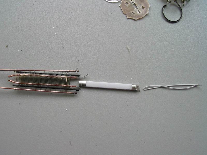 1:阳极;2:栅极,栅极里白色部分是栅极和阴极的绝缘层;3 就是阴极,这是个扁型金属管,灯丝就包在里面啦。
